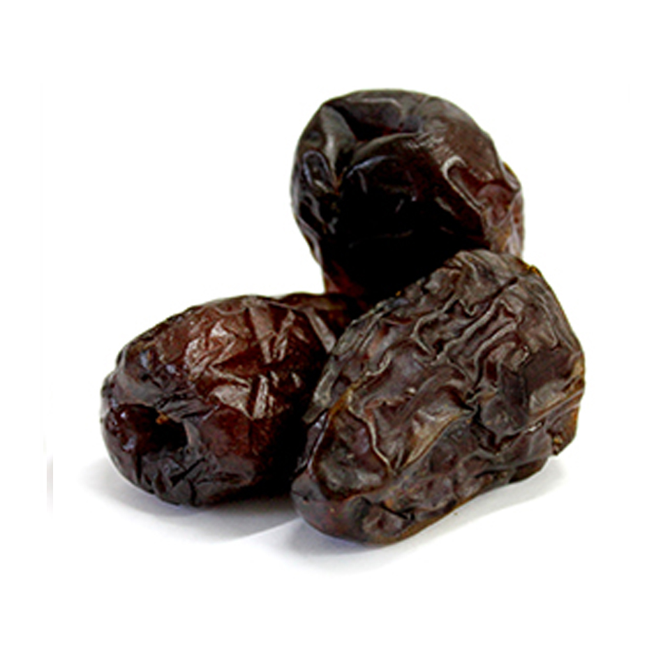 Dark color oval shaped date, creased skin and sweet chewy flesh giving it a prune like texture.